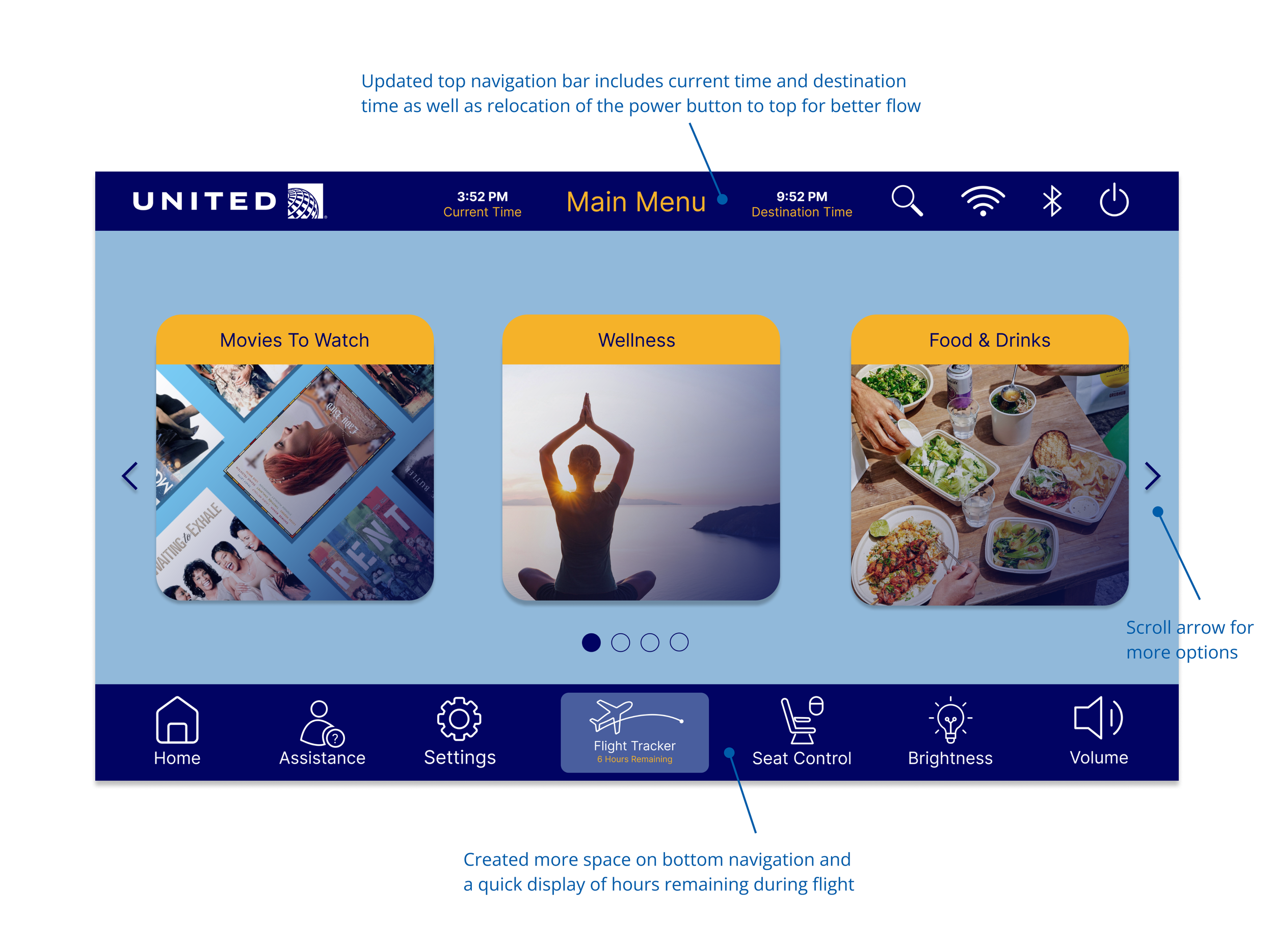 I gathered United Airlines’ asset inventory to help create a mental model of how they organize their entertainment system that I could incorporate into my own design. I examined their branding to identify the styles used in their current system. It became evident that my design solution needed to include clear, distinct tabs for users to engage with the system.